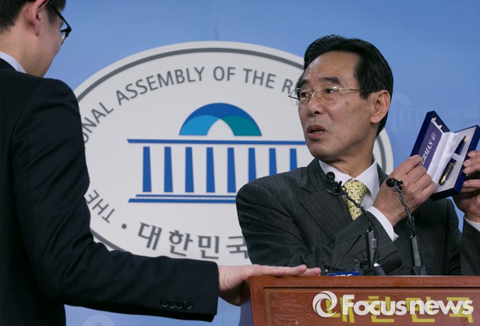 (서울=포커스뉴스) 홍창선 더불어민주당 공천관리위원장이 9일 오전 서울 여의도 국회 정론관에서 20대 총선 1차 경선지역과 관련 브리핑 중 "먼저 문자를 보낸 취재진에게 선물을 주겠다"며 전한 뒤 당첨된 기자에게 선물을 보여주고 있다. 홍 위원장은 이날 브리핑 중 취재관행을 바꾸기 위한 언론인과 대화를 하던 중 일부 항의를 받았다.