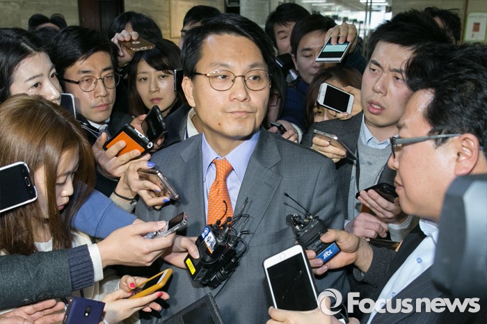 (서울=포커스뉴스) 김무성 새누리당 대표를 향한 욕설로 당내 파문을 일으킨 윤상현 의원이 9일 오전 서울 여의도 새누리당 대표최고위원실 앞 로비에서 기자들의 질문에 답변하고 있다. 전날 윤 의원은 전화를 통해 김 대표를 거론하며 욕설한 사실이 언론에 공개됐으며, 이날 김 대표에게 면담을 요청했으나 거절됐다.