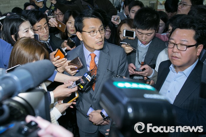 (서울=포커스뉴스) 김무성 새누리당 대표를 향한 욕설로 당내 파문을 일으킨 윤상현 의원이 9일 오전 서울 여의도 새누리당 대표최고위원실 앞 로비에서 기자들의 질문에 답변하고 있다. 전날 윤 의원은 전화를 통해 김 대표를 거론하며 욕설한 사실이 언론에 공개됐으며, 이날 김 대표에게 면담을 요청했으나 거절됐다.