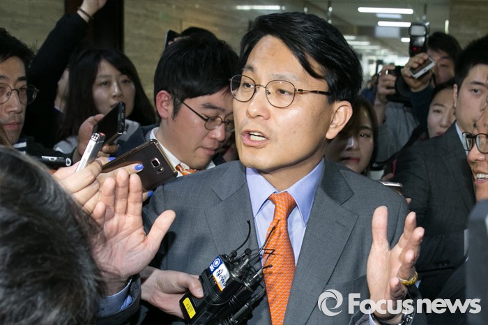 (서울=포커스뉴스) 김무성 새누리당 대표를 향한 욕설로 당내 파문을 일으킨 윤상현 의원이 9일 오전 서울 여의도 새누리당 대표최고위원실 앞 로비에서 기자들의 질문에 답변하고 있다. 전날 윤 의원은 전화를 통해 김 대표를 거론하며 욕설한 사실이 언론에 공개됐으며, 이날 김 대표에게 면담을 요청했으나 거절됐다.