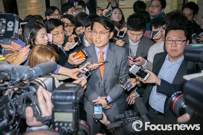 (서울=포커스뉴스) 김무성 새누리당 대표를 향한 욕설로 당내 파문을 일으킨 윤상현 의원이 9일 오전 서울 여의도 새누리당 대표최고위원실 앞 로비에서 기자들의 질문에 답변하고 있다. 전날 윤 의원은 전화를 통해 김 대표를 거론하며 욕설한 사실이 언론에 공개됐으며, 이날 김 대표에게 면담을 요청했으나 거절됐다.
