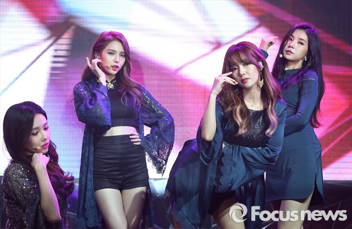(서울=포커스뉴스) 9일 오전 서울 마포구 예스24 무브홀에서 열린 걸그룹 피에스타의 미니앨범 'A Delicate Sense' 발표 쇼케이스에 참석한 멤버들이 신곡 'Mirror'의 무대를 선보이고 있다. 왼쪽부터 멤버 린지, 재이, 혜미, 차오루.