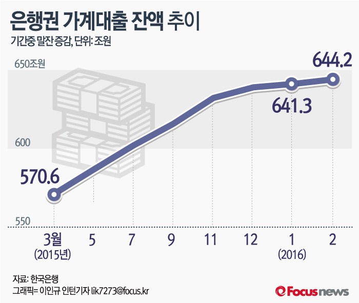 (서울=포커스뉴스) 한국은행이 9일 발표한 '2016년 2월중 금융시장 동향'을 보면 올해 2월 은행권 가계대출 잔액은 전월 대비 3조원 증가해 644조2000억원에 이른다.
