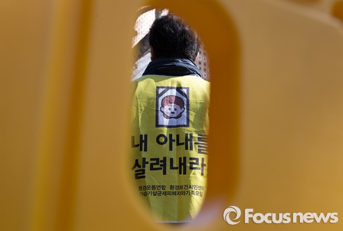 (서울=포커스뉴스) 9일 오전 서울 종로구 SK서린빌딩 앞에서 환경보건시민센터를 비롯한 가습기살균제피해자와가족모임 회원들이 '가습기살균제 피해 관련 고발 기자회견'을 하고 있다.