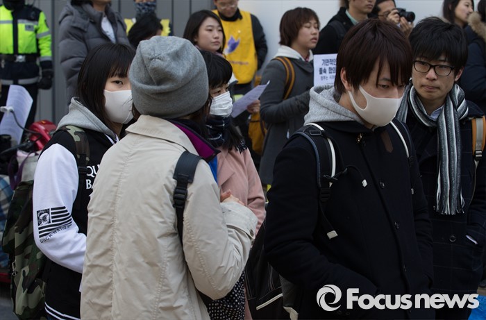 (서울=포커스뉴스) 9일 오후 서울 종로구 옛 주한일본대사관 앞에서 열린 '제1221차 일본군 위안부 문제해결을 위한 정기 수요시위'에서 일본인들이 수요시위에 대한 설명을 듣고 있다.