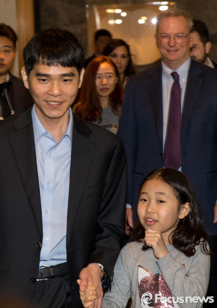 (서울=포커스뉴스) 9일 오후 서울 종로구 포시즌스 호텔에서 열린 '구글 딥마인드 챌린지 매치'에서 이세돌 9단이 딸 혜림양과 함께 대국장으로 향하고 있다. 뒤는 부인 김현진씨와 에릭 슈미트 구글 회장.