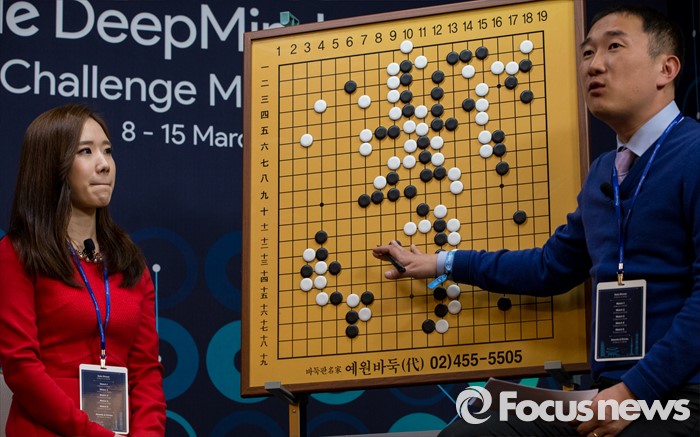 (서울=포커스뉴스) 9일 오후 서울 종로구 포시즌스 호텔에서 열린 이세돌 9단과 알파고의 대국 '구글 딥마인드 챌린지 매치'에서 해설진이 알파고의 백90수(좌하귀)가 실착임을 설명하고 있다.
