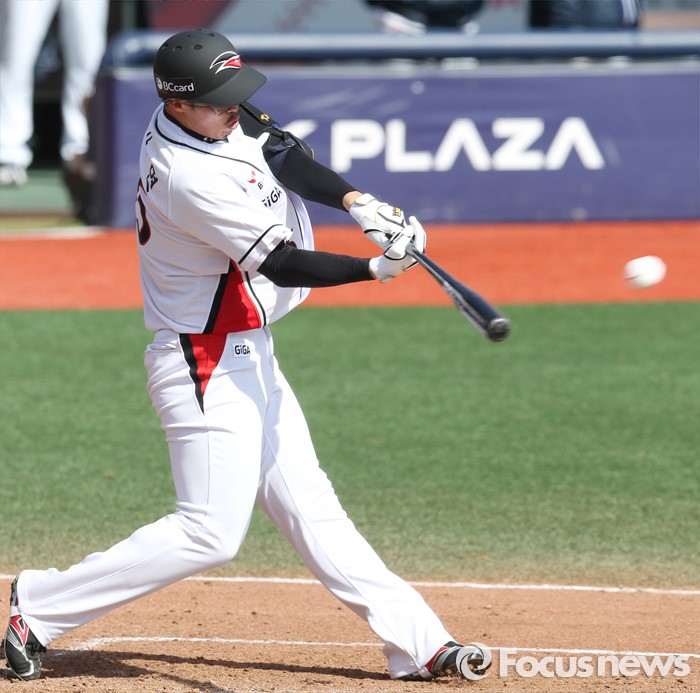 (수원=포커스뉴스) 9일 수원 kt위즈파크에서 열린 2016 KBO리그 시범경기 두산-kt 경기에서 4회말 kt 김사연이 좌익수앞 2루타를 날리고 있다.