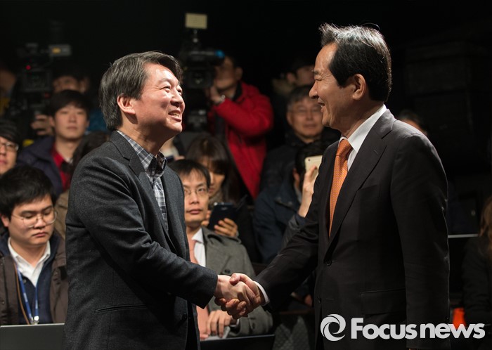 (서울=포커스뉴스) 안철수 국민의당 상임공동대표가 9일 오후 서울 종로구 아름다운극장에서 열린 인공지능과 바둑 심포지움 콘서트 '이세돌-알파고 바둑 대국 관람'에 참석해 정세균 더불어민주당 의원과 악수하고 있다.