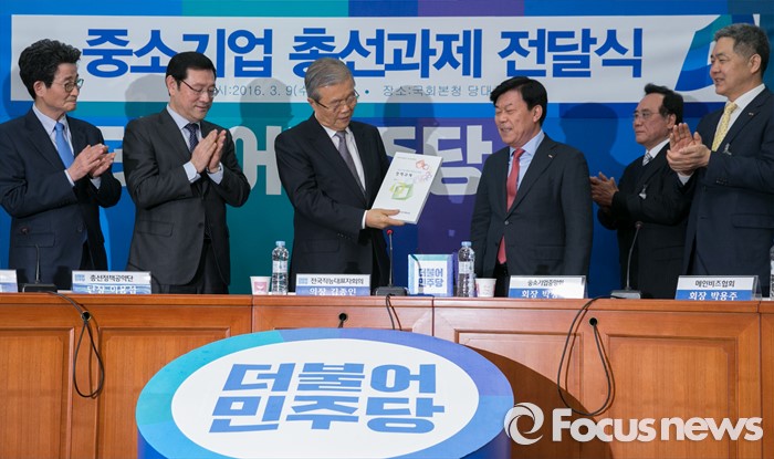 (서울=포커스뉴스) 김종인(왼쪽 세번째) 더불어민주당 비대위 대표가 9일 오후 서울 여의도 국회에서 열린 중소기업중앙회 회장단 총선과제 전달식에 참석해 박성택(오른쪽 세번째) 중소기업중앙회장으로부터 과제를 전달받고 있다.