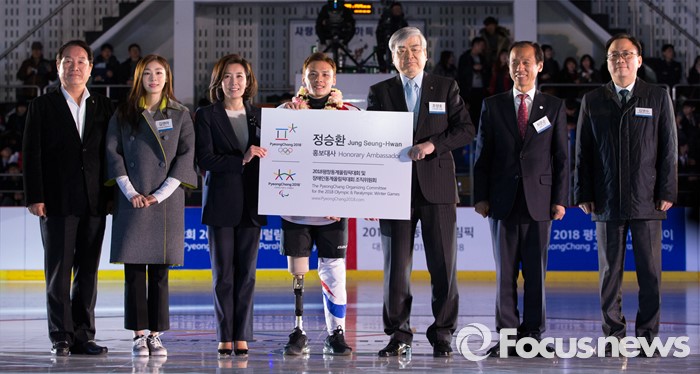 (춘천=포커스뉴스) 9일 오후 강원 춘천의암빙상장에서 열린 제2회 2018 평창 패럴림픽 데이에서 패럴림픽 홍보대사로 위촉된 아이스슬레지하키 선수 정승환(오른쪽 네번째)이 내빈들과 기념촬영을 하고 있다. 오른쪽 두번째부터 최문순 강원도지사, 조양호 평창동계올림픽 조직위원장, 정 선수, 나경원 국제장애인올림픽위원회(IPC) 집행위원, 평창올림픽 홍보대사 김연아.