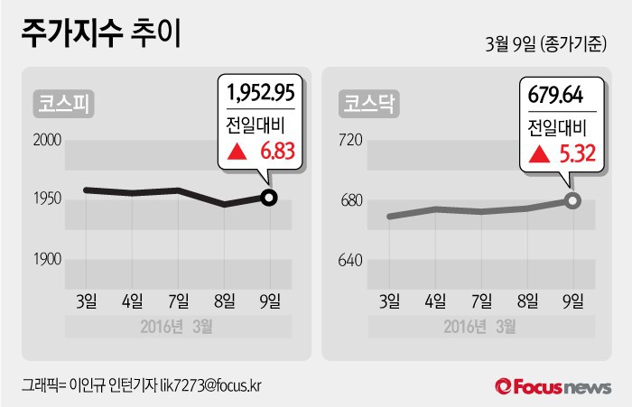 (서울=포커스뉴스) 9일 코스피지수는 전날 보다 0.35%(6.83포인트) 오른 1952.95에 장을 마쳤다. 코스닥지수는 전일 대비 0.79%(5.32포인트) 오른 679.64에 마감했다.