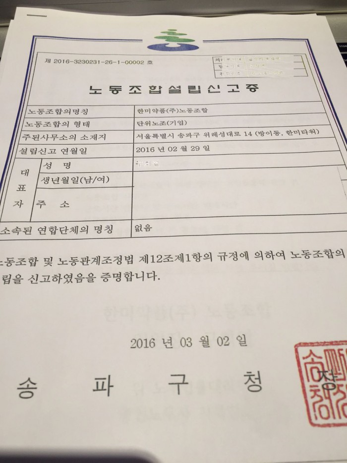 사무국장은 “한미약품은 정책 문제가 발생할 때 소명기회 없이 통보를 하고 있다”며 “예를 들어 우리 회사 직원은 연봉 협상테이블에 앉아본 사람이 없다. 작년에는 연봉금액이 빠져있는 빈용지를 주고, 사인하라고 하더라. 이것이 글로벌을 지향하고 제약산업을 선도하고 있는 회사의 모습이다”고 주장했다.한미약품 노동조합 신고증. <사진출처=한미약품 노동조합>