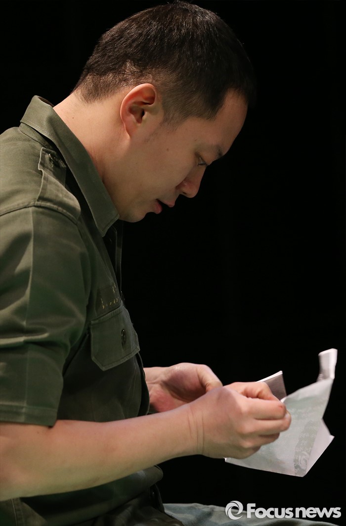 (서울=포커스뉴스) 9일 오후 서울 종로구 선돌극장에서 열린 연극 '백중사 이야기' 프레스콜 행사에 정이병 역할을 맡은 배우 김대영이 주요장면을 시연하고 있다.