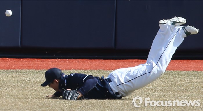 (수원=포커스뉴스) 9일 수원 kt위즈파크에서 열린 2016 KBO리그 시범경기 두산-kt 경기에서 4회말 두산 좌익수 김재환이 kt 김사연의 타구를 다이빙 캐치 했으나 빠뜨리고 있다.