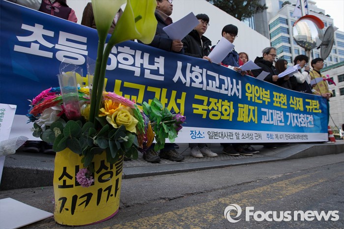 (서울=포커스뉴스) 9일 오후 서울 종로구 옛 일본대사관 앞에서 '초등학교 사회교과서 위안부 표현 삭제 규탄 기자회견'에 참가한 전국교육대학생연합 회원들이 역사교과서 국정화 폐지를 촉구하고 있다.
