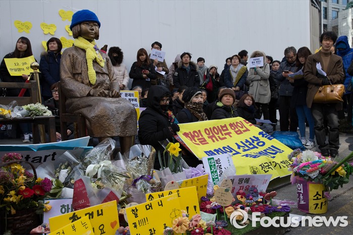 (서울=포커스뉴스) 9일 오후 서울 종로구 옛 일본대사관 앞에서 열린 '일본군 위안부 문제해결을 위한 1221차 정기 수요집회'에서 참가자들이 일본정부의 공식 사과를 촉구하고 있다.