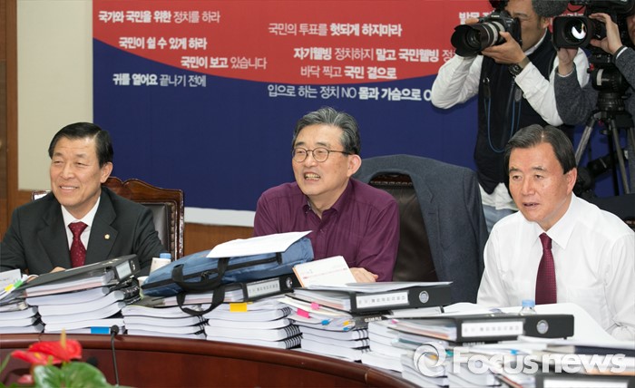 이 위원장은 지난 8일 김무성 새누리당 대표에 대한 윤 의원의 욕설에 대해 "공천심사에 너무 많은 요소를 감안하면 공천심사를 할 수 없다"며 "우리는 룰이 있으니 룰대로만 해야지"라고 선을 그었다.(서울=포커스뉴스) 8일 오후 서울 여의도 새누리당사에서 열린 20대 총선 분구·통합·경계조정 지역구 공천신청자 면접에 이한구 공천관리위원장이 예비후보들에게 질문하고 있다. 왼쪽부터 황진하 부위원장, 이 위원장, 홍문표 위원. 2016.03.08 박동욱 기자