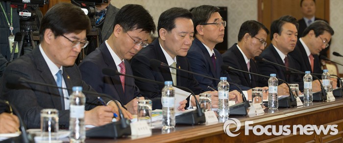 (서울=포커스뉴스) 10일 오전 서울 종로구 정부서울청사에서 열린 국가정책조정회의에서 이기권(오른쪽 네번째부터) 고용노동부 장관, 김현웅 법무부 장관, 강신명(오른쪽 두번째) 경찰청장을 비롯한 참석자들이 황교안 국무총리의 모두발언을 듣고 있다.