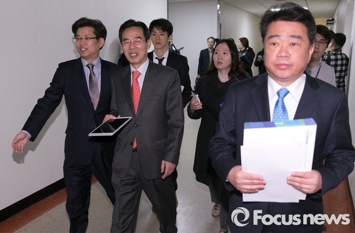 (서울=포커스뉴스) 홍창선(가운데) 더불어민주당 공천관리위원장과 김성수(오른쪽) 대변인이 10일 오전 서울 여의도 국회 정론관에서 20대 총선 경선 및 단수지역과 2차 공천배제(컷오프) 명단 발표를 마친 뒤 퇴장하고 있다.