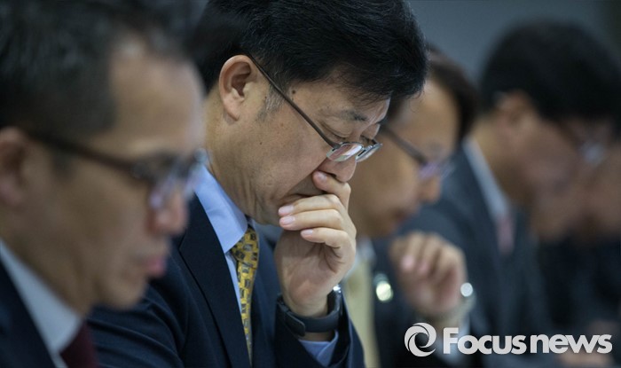 (서울=포커스뉴스) 10일 오전 서울 중구 금융위원회에서 정은보(오른쪽 네번째) 금융위원회 부위원장이 주재하는 '北'사이버 테러 대비 회의'가 열린 가운데 회의에 참석한 은행 관계자들이 심각한 표정으로 정 부위원장의 모두발언을 듣고 있다.