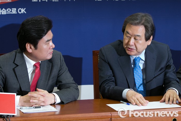 (서울=포커스뉴스) 김무성(오른쪽) 새누리당 대표와 원유철 원내대표가 10일 오전 서울 여의도 국회에서 열린 최고위원회의에 참석해, 욕설 논란을 일으킨 윤상현 의원의 최고위 소명 기회 부여에 대해 대화하고 있다.