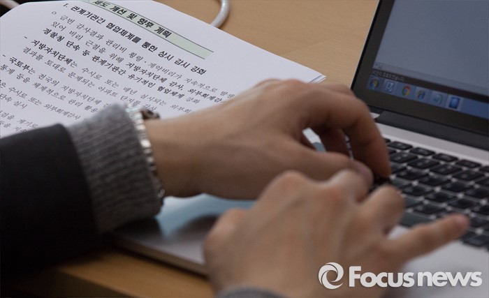 (세종=포커스뉴스) 10일 오전 세종시 정부세종청사 1동 브리핑실에서 전국 아파트 관리실태 점검 및 개선대책 마련 브리핑에서 취재진이 노트북으로 취재를 하고 있다.