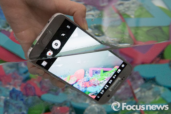 (서울=포커스뉴스) 10일 오전 서울 중구 신라호텔에서 열린 삼성전자의 스마트폰 갤럭시 S7 엣지의 방수 성능을 모델이 시연하고 있다.