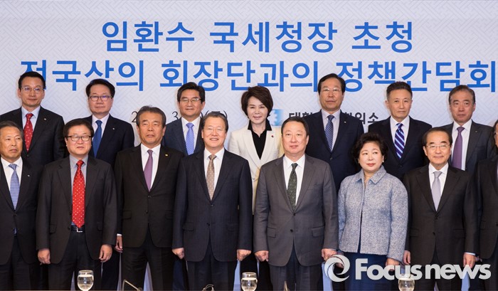 (서울=포커스뉴스) 10일 오전 서울 중구 대한상공회의소에서 열린 국세청장 초청 전국상의 회장단 정책간담회에 참석한 임환수 국세청장(앞줄 왼쪽 네번째부터), 박용만 대한상의 회장, 현정은 현대그룹 회장을 비롯한 상의 회장단이 기념촬영을 하고 있다.