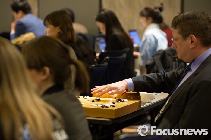 (서울=포커스뉴스) 10일 오후 서울 종로구 포시즌스호텔 기자실에서 한 외신 기자가 이세돌 9단과 구글 인공지능 알파고의 '구글 딥마인드 챌린지 매치' 2차 대국을 보며 직접 바둑을 두고 있다.