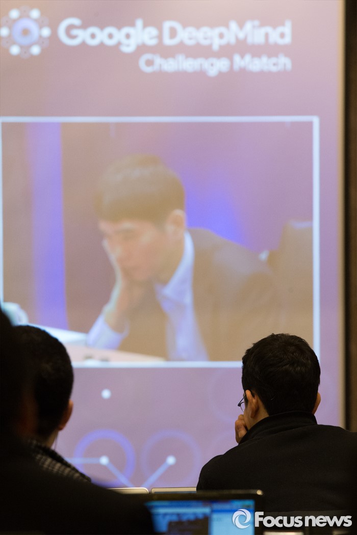 (서울=포커스뉴스) 10일 오후 서울 종로구 포시즌스호텔 기자실에서 취재진들이 이세돌 9단과 구글 인공지능 알파고의 '구글 딥마인드 챌린지 매치' 2차 대국을 지켜보고 있다.