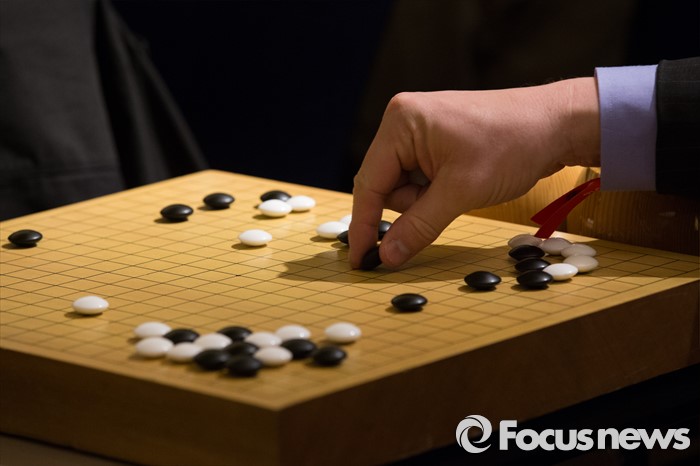 (서울=포커스뉴스) 10일 오후 서울 종로구 포시즌스호텔 기자실에서 한 외신 기자가 이세돌 9단과 구글 인공지능 알파고의 '구글 딥마인드 챌린지 매치' 2차 대국을 보며 직접 바둑을 두고 있다.