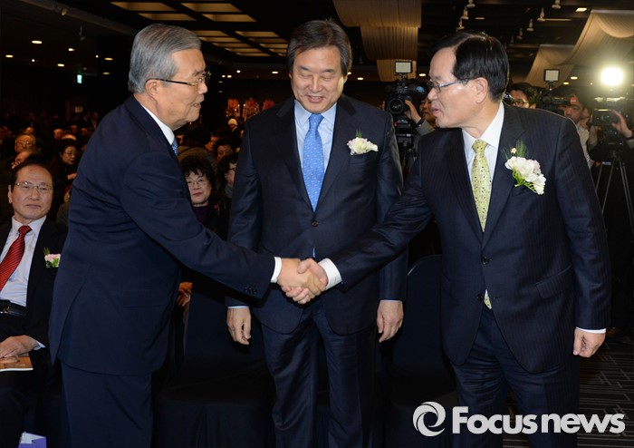 (서울=포커스뉴스) 정의화(오른쪽) 국회의장과 김종인(왼쪽) 더불어민주당 비대위 대표가 10일 오후 서울 종로구 세종문화회관 세종홀에서 열린 김종필 전 국무총리의 정치인생을 담은 '김종필 증언록' 출판기념회에 참석해 인사하고 있다. 가운데는 김무성 새누리당 대표.
