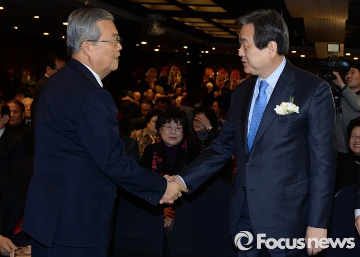 (서울=포커스뉴스) 김무성(오른쪽) 새누리당 대표와 김종인 더불어민주당 비대위 대표가 10일 오후 서울 종로구 세종문화회관 세종홀에서 열린 김종필 전 국무총리의 정치인생을 담은 '김종필 증언록' 출판기념회에 참석해 인사하고 있다.