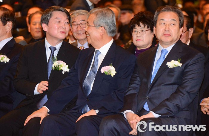(서울=포커스뉴스) 김종인(가운데) 더불어민주당 비대위 대표와 안철수(왼쪽) 국민의당 상임공동대표가 10일 오후 서울 종로구 세종문화회관 세종홀에서 열린 김종필 전 국무총리의 '김종필 증언록' 출판기념회에 참석해 대화하고 있다. 오른쪽은 김무성 새누리당 대표.