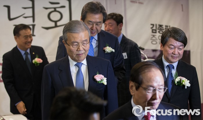 (서울=포커스뉴스) 10일 오후 서울 종로구 세종문화회관에서 열린 김종필 전 국무총리 출판기념회에서 떡 컷팅식을 마친 후 3당 대표들이 무대를 빠져나오고 있다. 중앙 왼쪽부터 김종인 더불어민주당 비상대책위원회 대표, 안철수 국민의당 상임공동대표 그리고 뒤이어 따라 나오는 김무성 새누리당 대표.