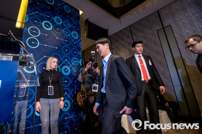 (서울=포커스뉴스) 프로바둑기사 이세돌 9단이 10일 오후 서울 종로구 포시즌스 호텔에서 열린 '구글딥마인드 챌린지 매치' 인공지능 '알파고'와의 제2국에 불계패를 당한 뒤 기자회견장으로 들어서고 있다.