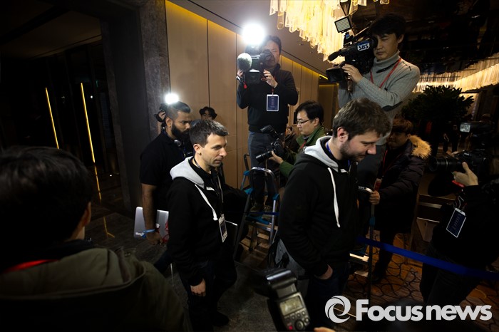 (서울=포커스뉴스) 10일 오후 서울 종로구 포시즌스 호텔에서 열린 '구글딥마인드 챌린지 매치' 이세돌 9단과 인공지능 알파고 바둑 제2국에서 딥마인드 팀원들이 경기를 마친 뒤 기자회견장으로 들어서고 있다.