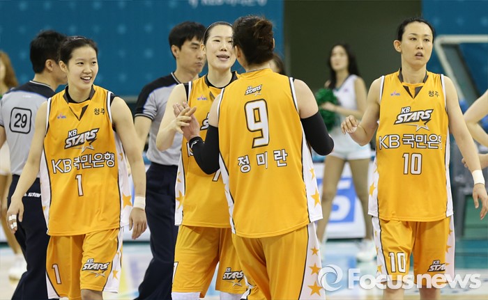 (부천=포커스뉴스) 10일 부천체육관에서 열린 2015-2016 여자프로농구 PO 1차전 KEB하나-KB스타즈 경기에서 KEB하나를 물리친 KB스타즈 선수들이 코트에 모여 승리의 기쁨을 나누고 있다.