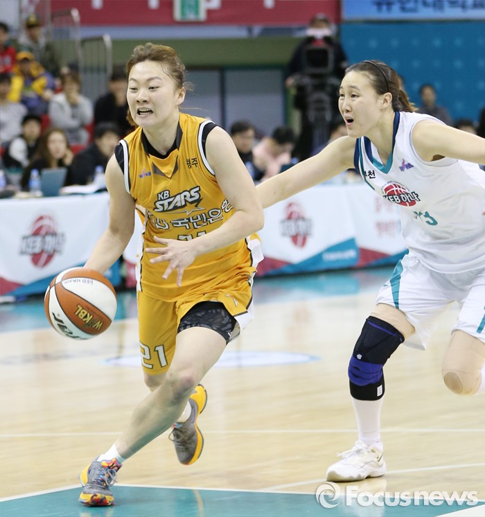 (부천=포커스뉴스) 10일 부천체육관에서 열린 2015-2016 여자프로농구 PO 1차전 KEB하나-KB스타즈 경기에서 KB스타즈 김진영이 KEB하나 김정은의 마크를 제치며 대시하고 있다.
