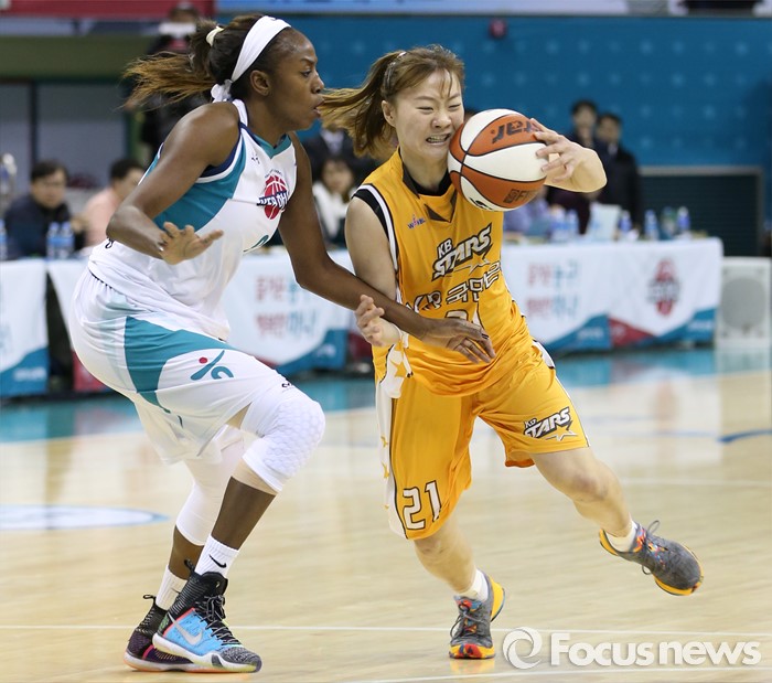 (부천=포커스뉴스) 10일 부천체육관에서 열린 2015-2016 여자프로농구 PO 1차전 KEB하나-KB스타즈 경기에서 KB스타즈 김진영이 KEB하나 모스비의 마크를 받으며 골밑을 향해 대시하고 있다.