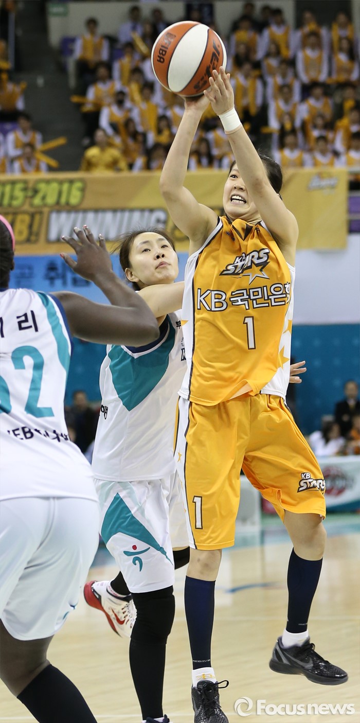 (부천=포커스뉴스) 10일 부천체육관에서 열린 2015-2016 여자프로농구 PO 1차전 KEB하나-KB스타즈 경기에서 KB스타즈 홍아란이 미들슛을 쏘고 있다.