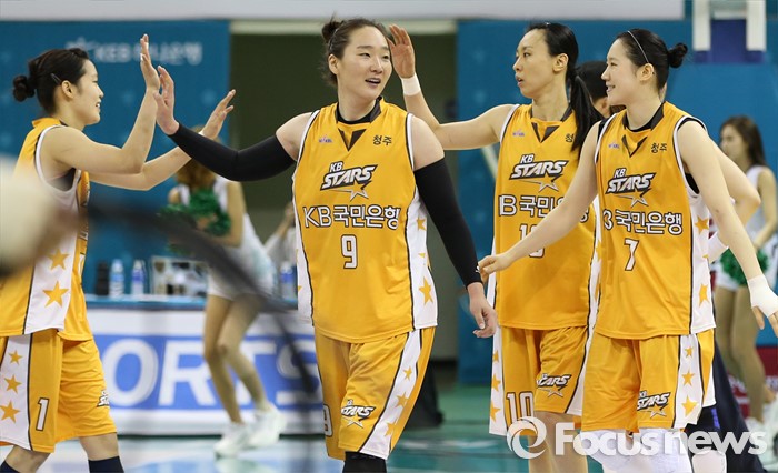 (부천=포커스뉴스) 10일 부천체육관에서 열린 2015-2016 여자프로농구 PO 1차전 KEB하나-KB스타즈 경기에서 KEB하나를 물리친 KB스타즈 선수들이 코트에 모여 승리의 기쁨을 나누고 있다.