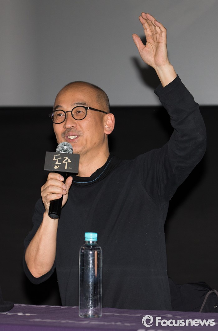 (서울=포커스뉴스) 10일 오후 서울 강남구 코엑스 메가박스에서 열린 영화 '동주'의 관객과의 대화에 참석한 이준익 감독이 관객들의 질문을 유도하고 있다.