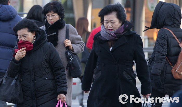 (서울=포커스뉴스) 사흘째 꽃샘추위가 이어지는 11일 오전 서울 2호선 구로디지털단지역 인근에서 시민들이 출근길을 재촉하고 있다.
