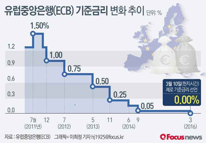 (서울=포커스뉴스) 유럽중앙은행(ECB)이 10일(현지시각) 기준 금리를 0.05%에서 0.00%로 낮춰 제로 기준금리를 선언했다.
