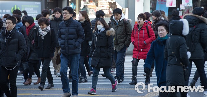 (서울=포커스뉴스) 사흘째 꽃샘추위가 이어지는 11일 오전 서울 2호선 구로디지털단지역 인근에서 시민들이 출근길을 재촉하고 있다.