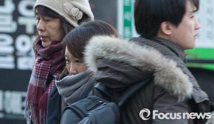 (서울=포커스뉴스) 사흘째 꽃샘추위가 이어지는 11일 오전 서울 2호선 구로디지털단지역 인근에서 시민들이 출근길을 재촉하고 있다.
