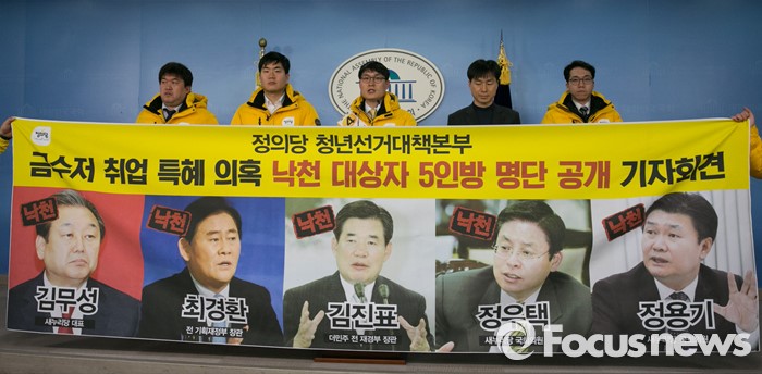 (서울=포커스뉴스) 11일 오전 서울 여의도 국회 정론관에서 정의당 청년선대본부가 금수저 취업 특혜 의혹 5인방 공천 낙마 촉구 기자회견을 하고 있다. 이날 명단에 발표된 5인방은 김무성 새누리당 대표, 최경환, 정우택, 정용기 의원, 김진표 전 더불어민주당 의원이다.