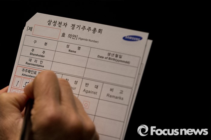 (서울=포커스뉴스) 11일 오전 서울 서초구 삼성전자 본사 다목적홀에서 열린 47기 정기주주총회에 참석한 한 주주가 표결용지에 인적사항을 기록하고 있다.